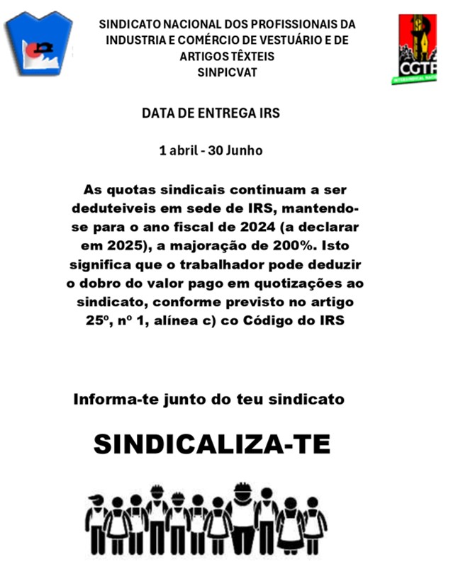 INFORMA-SE os associados do Sindicato do Vestuário - SINPICVAT que pagam as suas quotas, através do banco, ou diretamente no Sindicato, de que por telefone, ou qualquer outra via, que devem solicitar nos nossos serviços, a DECLARAÇÃO das quotas pagas para puderam usufruir do abatimento das mesmas em sede de IRS